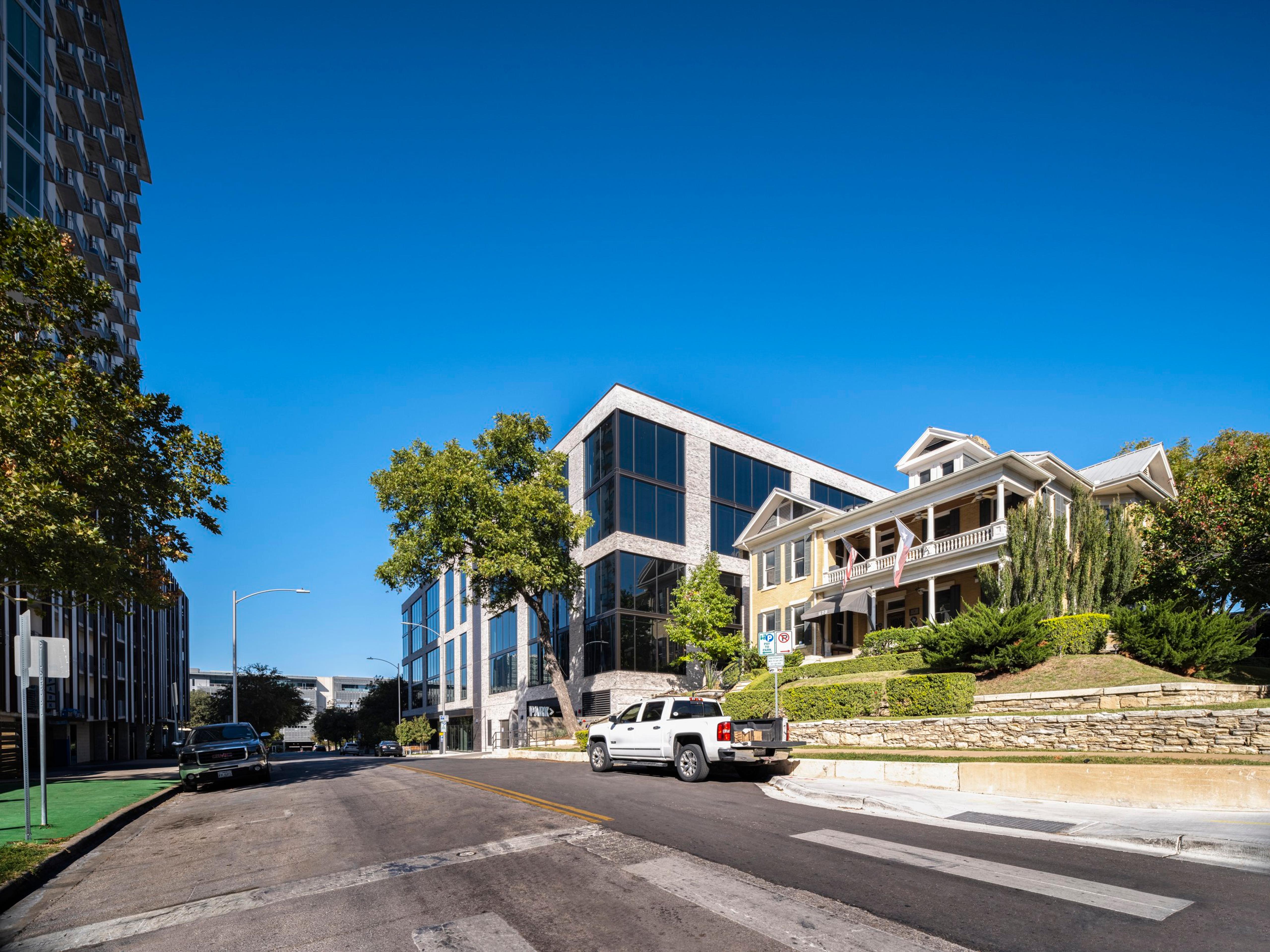 Every project is unique, and as architects it is our responsibility to not only design quality spaces for our clients but to also find creative solutions to the challenges that always arise. The prospect of creating a Class A office building at the crossroads of a historic neighborhood and Austin’s Central Business District (CBD) presented an intriguing challenge. Eagerly embracing the opportunity, we knew to expect multiple regulatory layers, site challenges, strong neighborhood interest, an adjacent historic house, and of course, the delicate balance of maximizing return on investment (ROI) for the owners. While we have learned to expect the unexpected, none of us could have anticipated the magnitude of the impact that a global pandemic would have not just on our project, but also the entire construction industry.