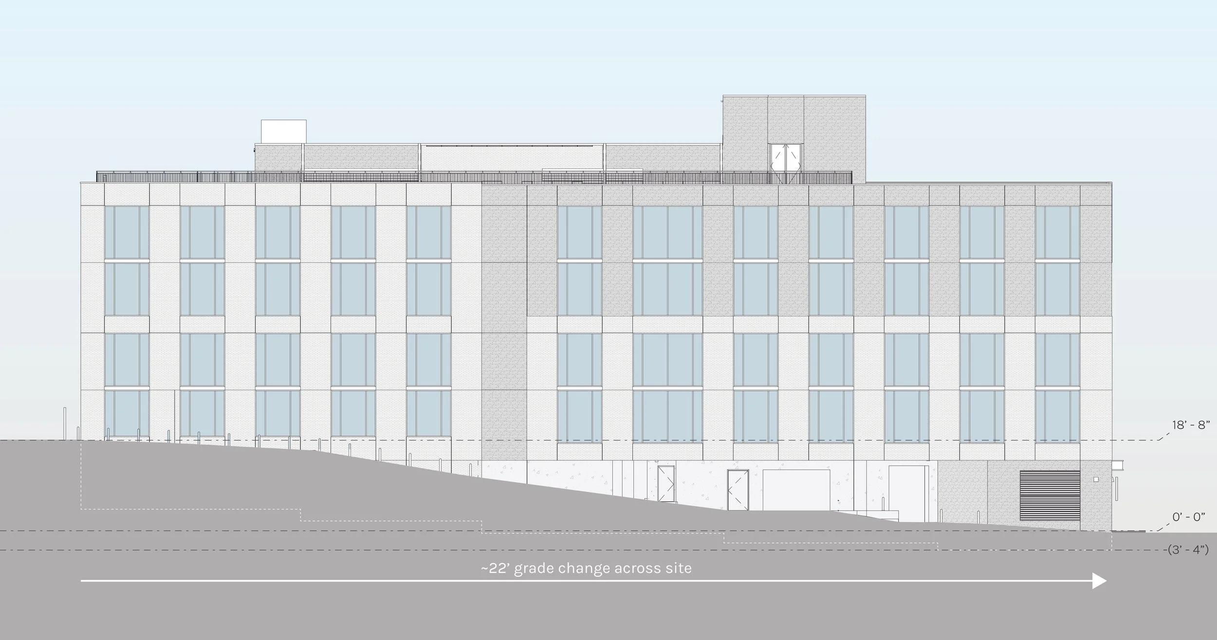 Beyond location, the site itself presented challenges such as a Capitol View Corridor (CVC) that runs through the northwest corner of the site and a 60’ height limitation due to a conditional overlay. To meet the proforma, BGKA was challenged to maximize quality leasable area while staying below the height limit. Each floor’s square footage was expanded as much as possible to the property lines. A 20’ grade change across the site presented its own issues, but also allowed the team to use the preconditions of the site to inform the design. The building’s 5-story height was achieved by placing about half of the first floor underground.