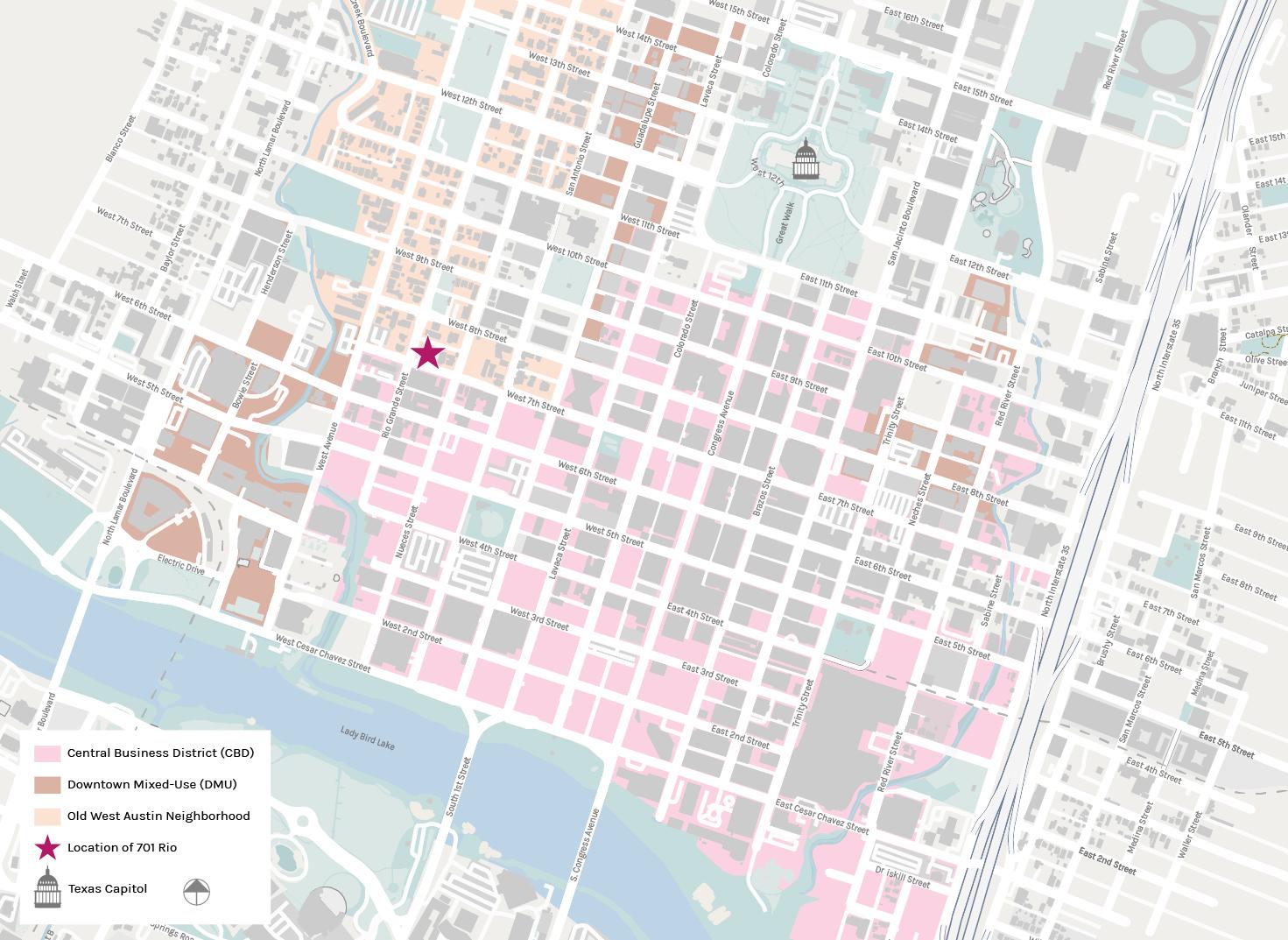 Perched at the junction of the historic Old West Austin neighborhood, the CBD, and Downtown Mixed-Use (DMU) districts, 701 Rio is a 124,200 gsf 5-story office space with ground floor retail and an underground parking garage. Within just 10’ of the east property line sits the Historic Martin House, one of several low-rise historic buildings and homes around the project registered and preserved by the Texas Historical Commission and the Original Austin Neighborhood Association (OANA). To the south stretches the CBD, where the properties increase in density and size to match Austin’s rapid growth.