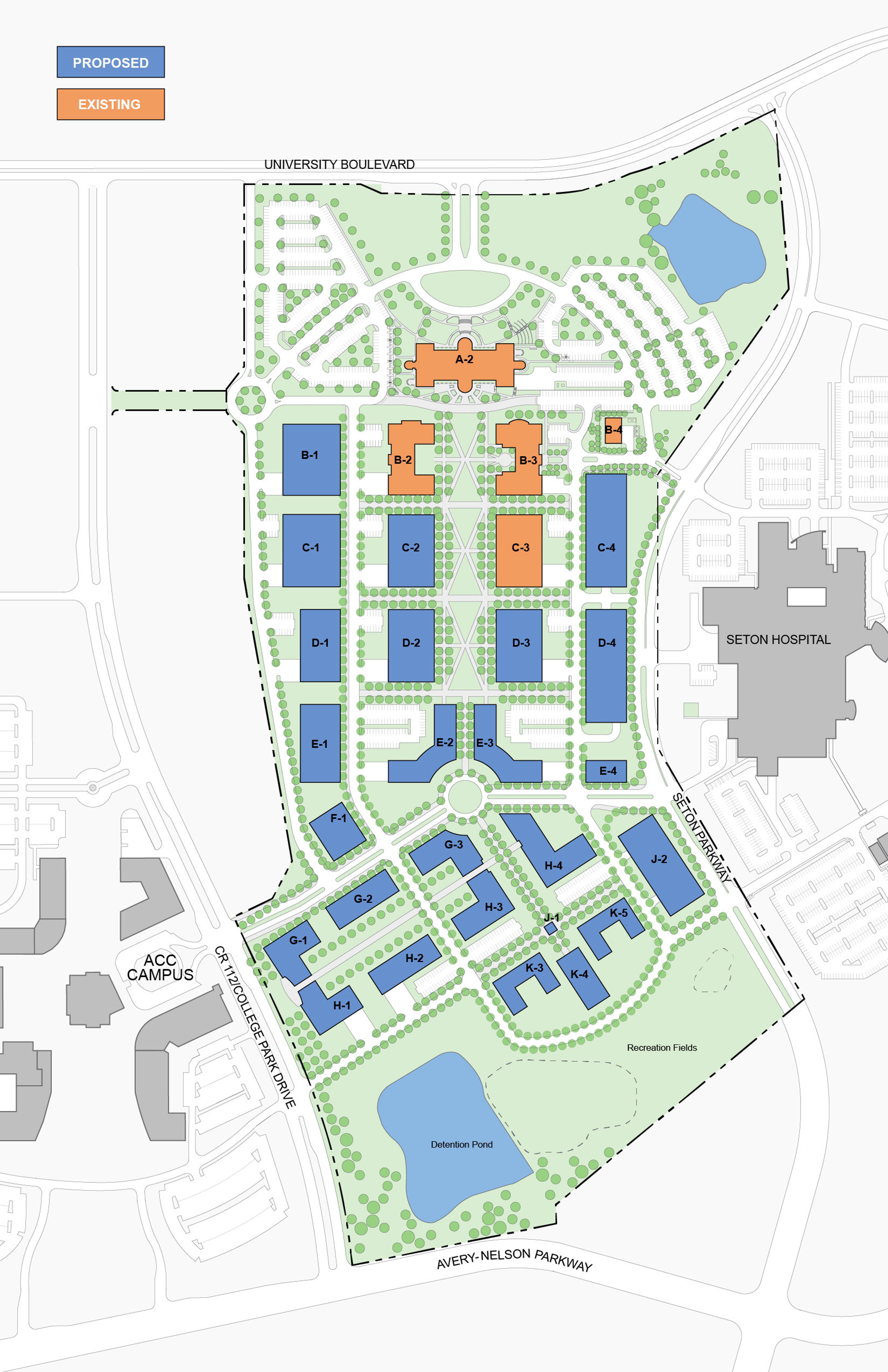 As the second building on the new Round Rock Campus, St. David’s School of Nursing began to define a large central open space through its relationship with the existing Avery Building. Although a campus master plan had been completed in the past, direction for the continued growth of the campus was necessary to guide future development of the CHP’s campus. BGK was selected to update Texas State University’s Round Rock Campus Master Plan,