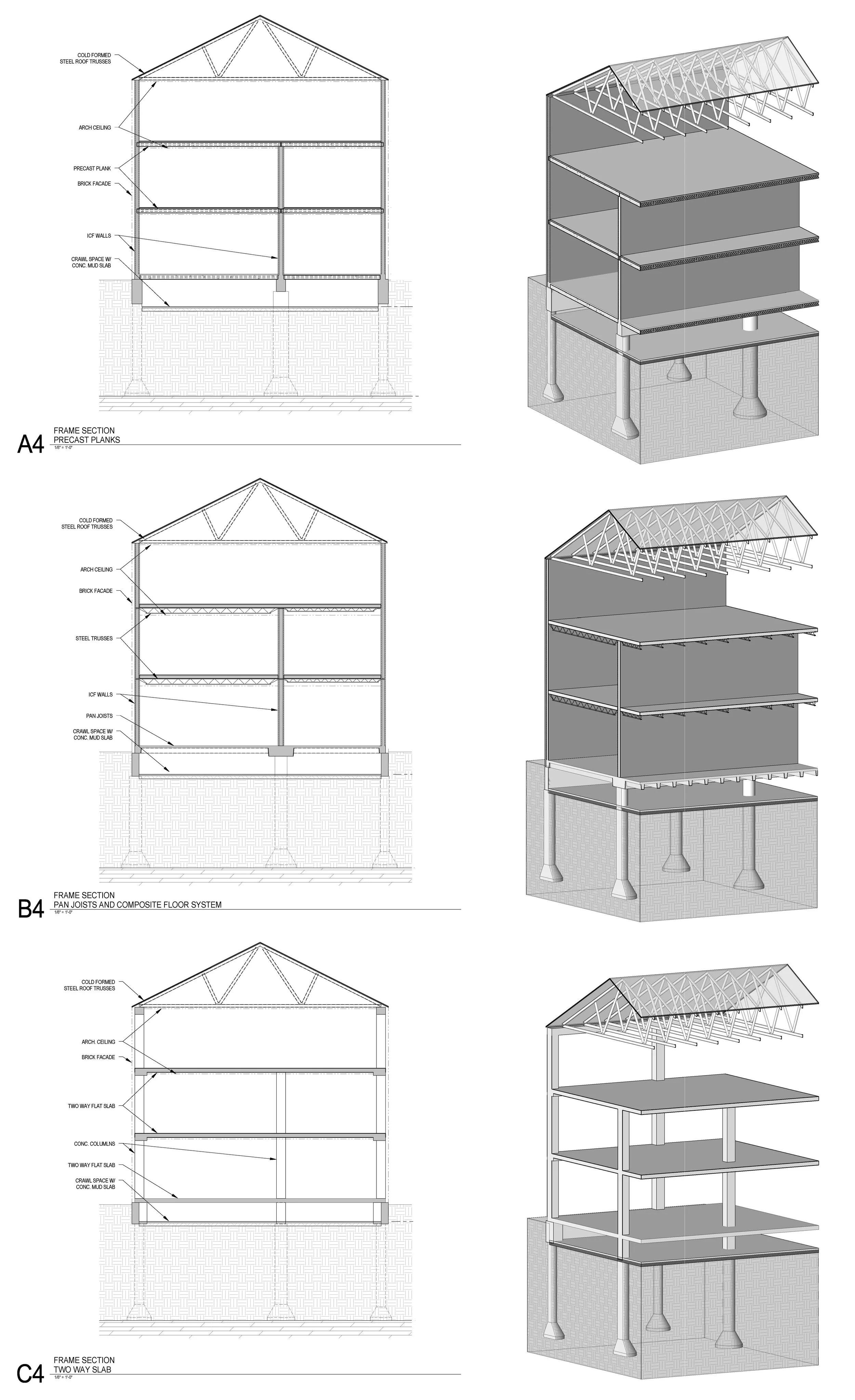 For a Housing Complex at Texas State University, the primary goal was to create a residence hall available and affordable to first generation college students. This resulted in the objective: to achieve ultimate affordability. An emphasis was placed on efficiency and functionalism, no high-end amenities were necessary. The site constraints dictated two seven story towers distributing 1,016 beds between them. The structural system needed to maximize the bed count and also work on a challenging site. Working with Vaughan, the contractor, six different structural options were evaluated considering criteria such as Historical Precedence, Constructability, LEED, Architectural Implications, MEP implications, Flexibility, and Cost. A weighted average for each option was determined out of a total possible 100 points to rule out options and to identify viable options worthy of further focus. We discovered that stick framing would not be an adequate structural system for this project, due to height and area limitations imposed by the building code. This analysis ultimately resulted in selecting a structural system of post-tensioned two-way concrete slabs with steel roof framing. In addition to providing longevity, flexibility, and economy, the system provided schedule advantages such as the ability to potentially utilize two concrete sub-contractors, one for each tower.