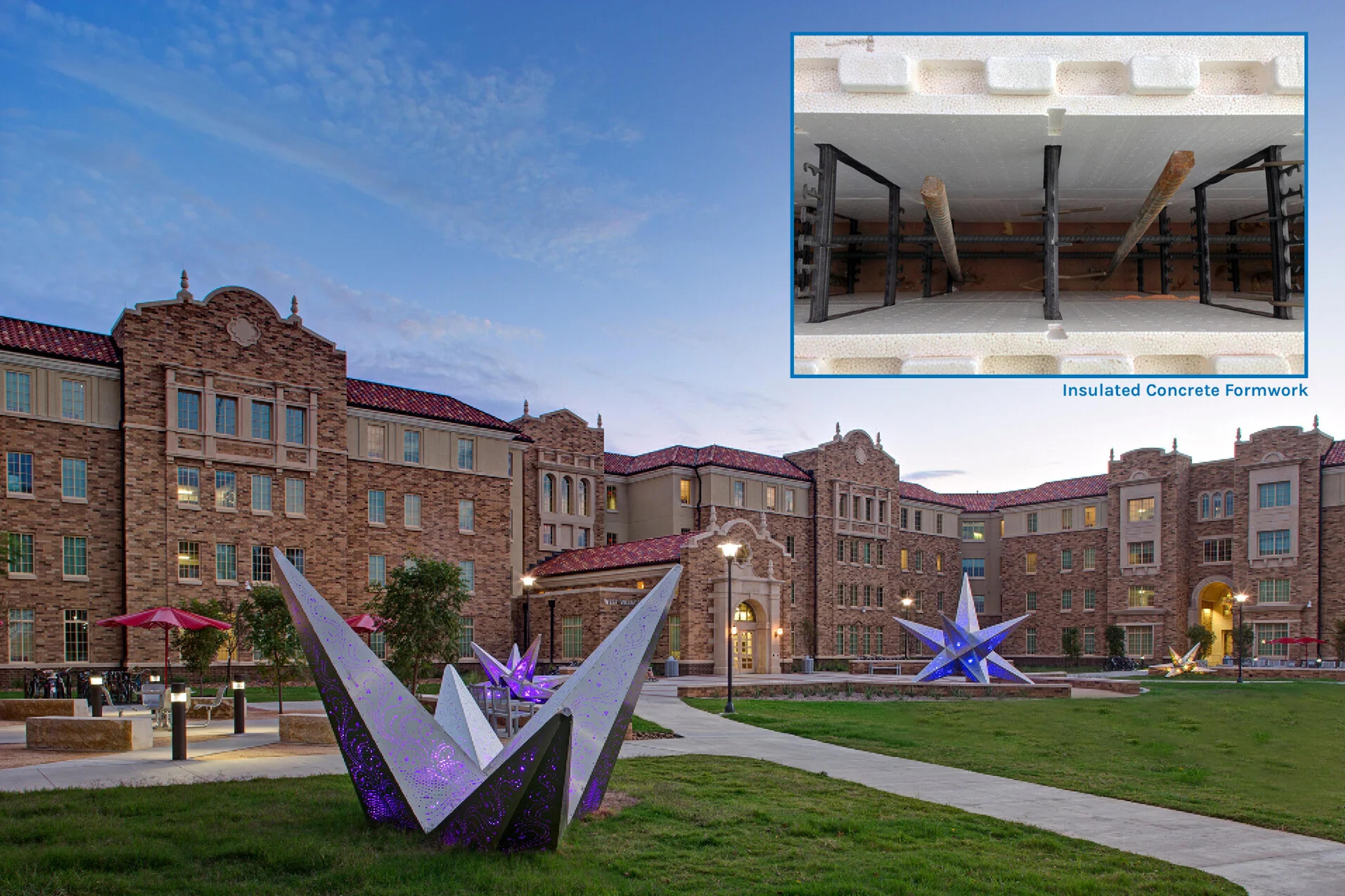 Lubbock, located in West Texas, experiences tornadoes and frequent strong winds. As part of the Design-Build team for two different Texas Tech University residence halls, the selection of a structural system that could endure such extreme conditions was paramount. With the University’s interest in Insulating Concrete Forms (ICF), our Design-Build team explored the system to determine its viability for the two residence halls. ICF is a system of formwork that results in reinforced cast-in-place concrete that are sandwiched between layers of insulation materials. These systems are strong and energy efficient because the insulation that stays in place permanently. With ICF proven optimal, various flooring options which could be used in conjunction with the ICF walls were further evaluated. Precast concrete planks with a concrete topping was decided on and used in conjunction with the ICF and helped speed erection time.