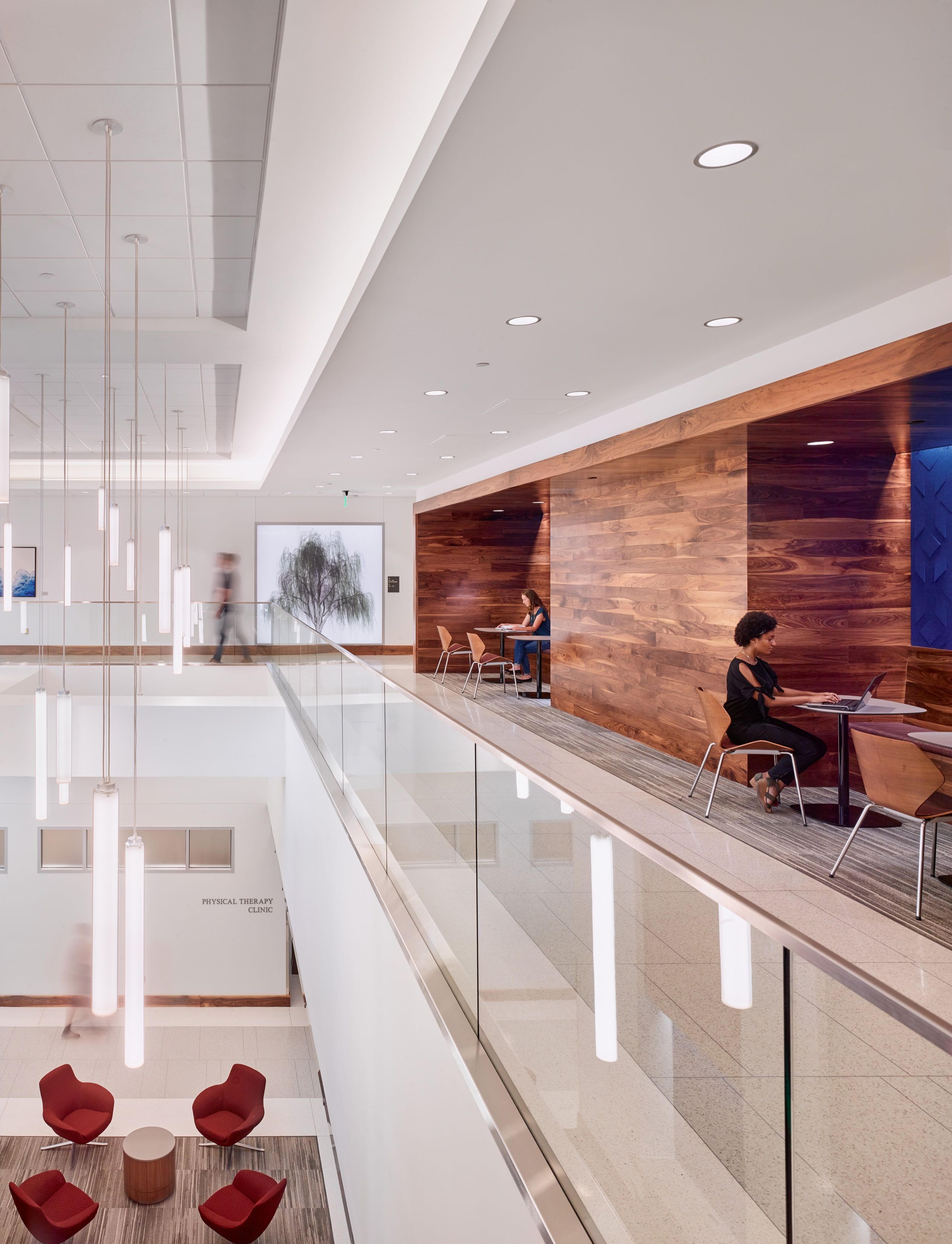 The program called for a 107,500 GSF building on a limited site with a three-story height limitation to align with other campus buildings. Those factors, along with a desire for a courtyard, necessitated placing program functions in a floor below grade. Certain programs were strategically placed on the below-grade level, such as the sleep research clinic and physical therapy clinic which housed heavy specialized exercise equipment. Adding to the challenge of building below-grade, the poor soil conditions on campus required careful control of drainage and waterproofing and necessitated a suspended slab at the basement. To bring daylight to the below-grade level, BGKA designed a